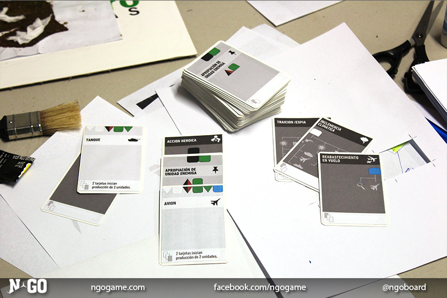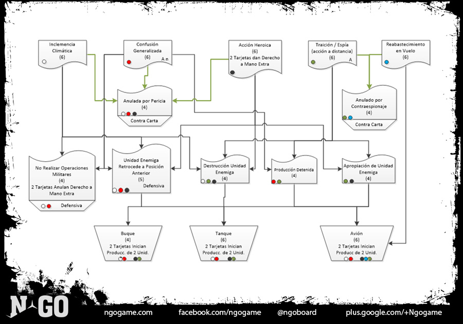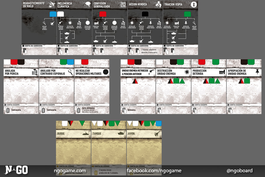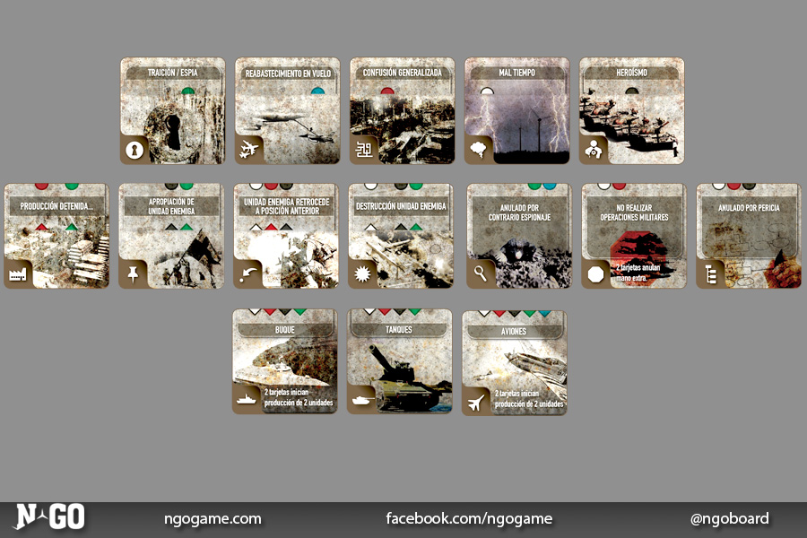 Los juegos de mesa suelen utilizar las cartas como complemento a dados y otras formas de ataque. En el caso de NGo BoardGame las cartas cumplen una función fundamental. Esto permite que un participante astuto pueda revertir cualquier situación adversa, complementar ataques, defensas, etc…